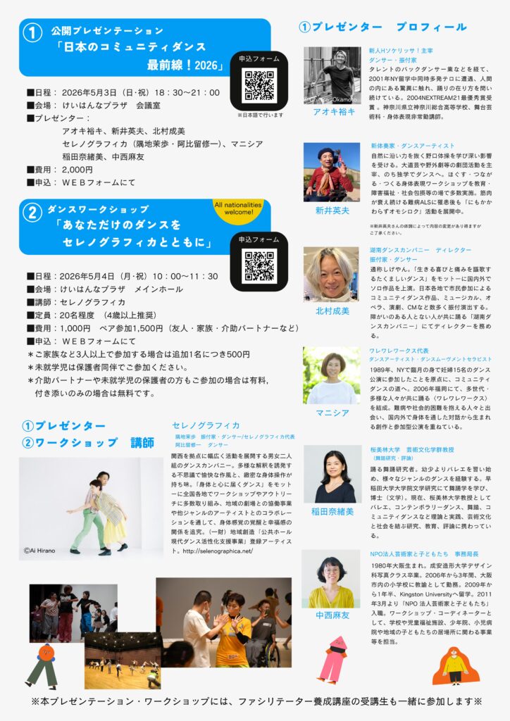 このスクールプログラムの一部を大公開! どなたでも参加できるプレゼンテーションとワークショップを通して、コミュニティダンスにふれてみましょう!①公開プレゼンテーション「日本のコミュニティダンス最前線!2026」