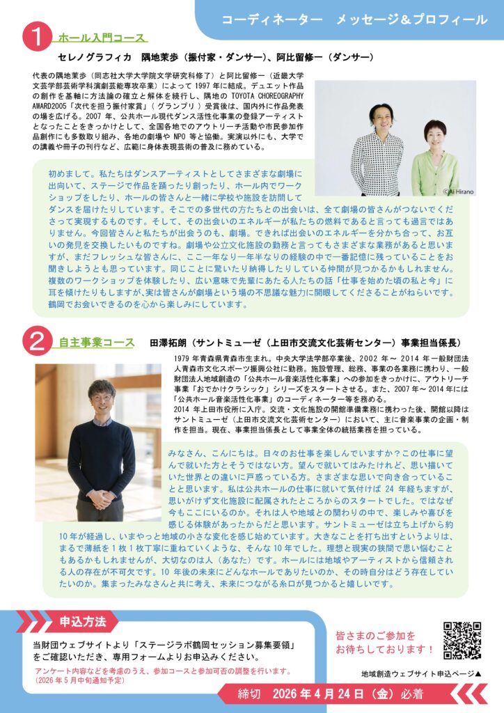 令和8(2026)年度の前期セッションは、荘銀タクト鶴岡(山形県)にて2コースを開催します。